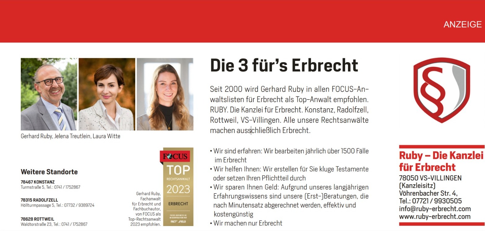 Radolfzell, Baden-Württemberg 578315 Telefon: 07732 9389724 E-Mail: info@ruby-erbrecht.de