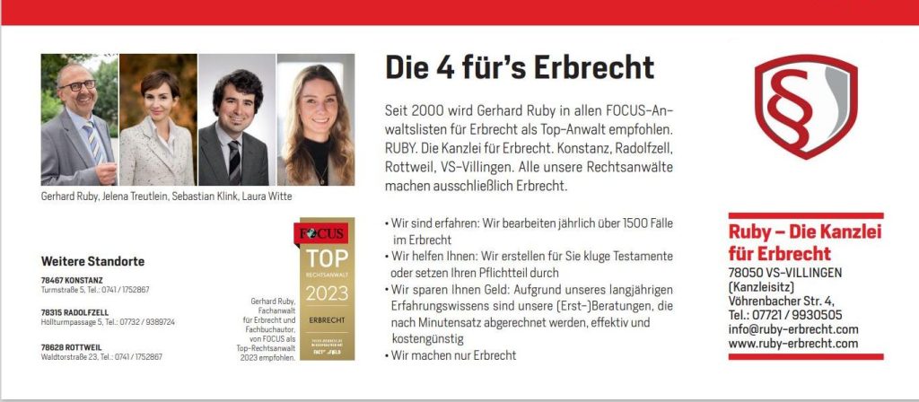 In der immer noch überschaubaren Welt der auf Erbrecht und Erbschaftsteuerrecht spezialisierten Anwaltschaft gehören wir zu den führenden deutschen Erbrechtskanzleien. Wir bearbeiten jährlich rund 1500 Fälle aus dem Erbrecht und Erbschaftsteuerrecht. Unsere Standorte sind Konstanz, Radolfzell am Bodensee, Rottweil und Villingen-Schwenningen. Daneben betreiben wir die Erbrechtsakademie Baden-Württemberg mit Standorten in Konstanz, Singen, Villingen-Schwenningen und Rottweil. Neue Filialen in Stuttgart (Königstraße), Tuttlingen (Bahnhofstraße) und Freiburg (Salzstraße) haben wir fest im Visier.