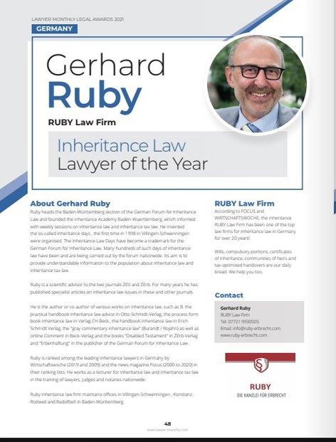 German Forum for Inheritance Law. Many hundreds of such days of inheritance law have been and are being carried out by the forum nationwide. Its aim is to provide understandable information to the population about inheritance law and inheritance tax law. Ruby is a scientific advisor to the two journals ZEV and ZErb. For many years he has published specialist articles on inheritance law issues in these and other journals. He is the author or co-author of various works on inheritance law, such as the practical handbook inheritance law advice in Otto-Schmidt-Verlag, the process form book inheritance law in Verlag CH Beck , the handbook inheritance law in Erich Schmidt Verlag, the „gray commentary inheritance law“ (Burandt / Rojahn) as well as online Comment in Beck-Verlag and the books „Disabled Testament“ in ZErb-Verlag and „Erbenhaftung“ in the publisher of the German Forum for Inheritance Law . Ruby is ranked among the leading inheritance lawyers in Germany by Wirtschaftswoche (2019 and 2009) and the news magazine Focus (2000 to 2020) in their ranking lists. He works as a lecturer for inheritance law and inheritance tax law in the training of lawyers, judges and notaries nationwide. Ruby inheritance law firm maintains offices in Villingen-Schwenningen , Konstanz ,Rottweil and Radolfzell in Baden-Württemberg.