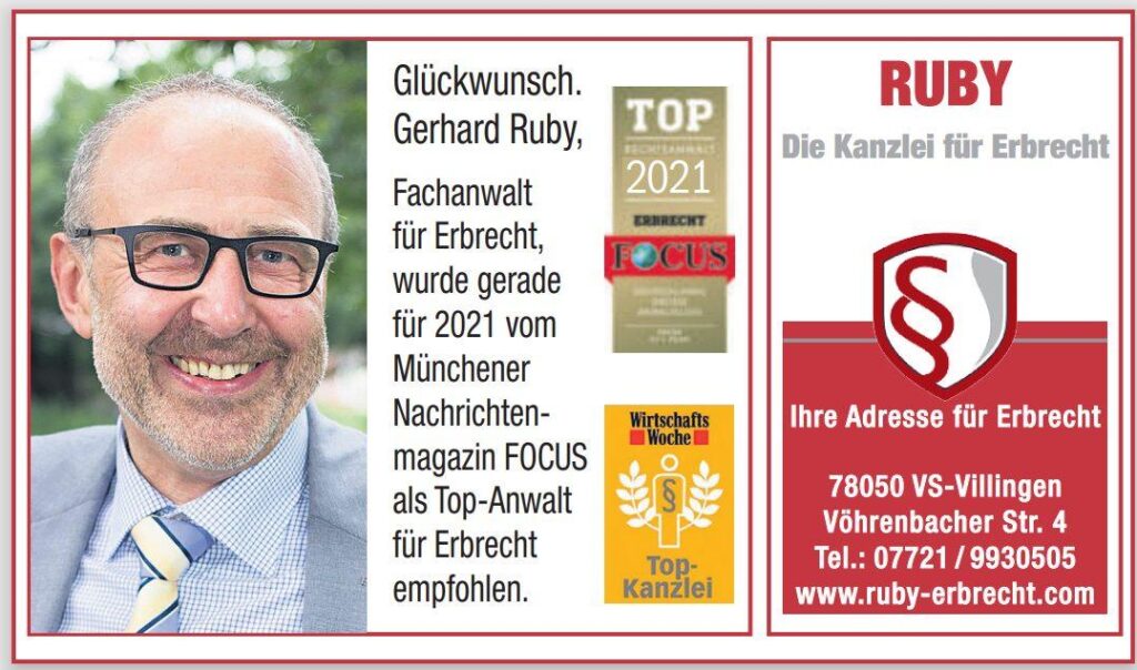 Erbrechtkanzlei Ruby – Wir machen nur Erbrecht – Wir helfen Ihnen – Überall in Deutschland – Tel. 07721 / 9930505