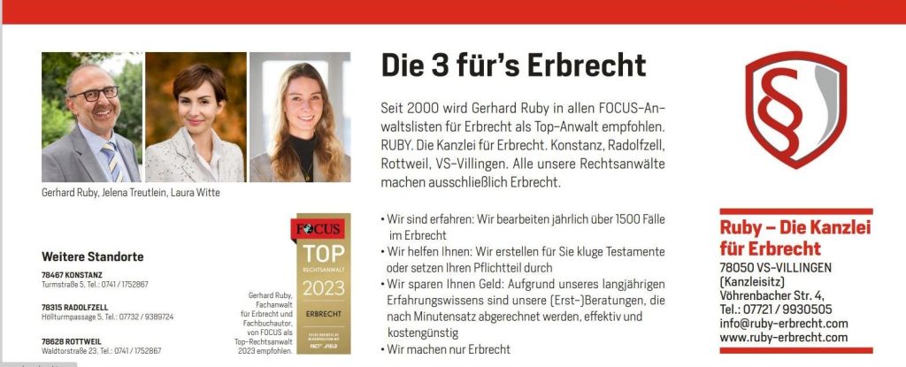 Durch Einsetzung im Testament Erbe werden. Erklärt von Gerhard Ruby, Fachanwalt für Erbrecht. Konstanz, Radolfzell, Rottweil, Villingen-Schwenningen.